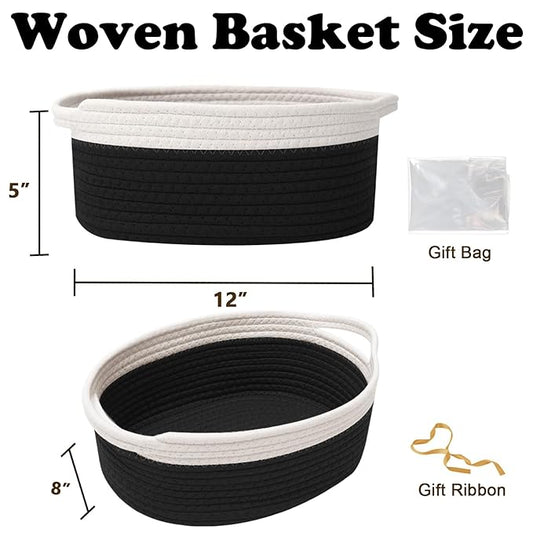 Gift Basket with Gift Bag and Ribbons,Small Rope Woven Shelf Storage,Baskets for Gifts Empty,Birthday,Shower,Decorative Organizer Box for Cat Dog Pet with Handles(White&Black)
