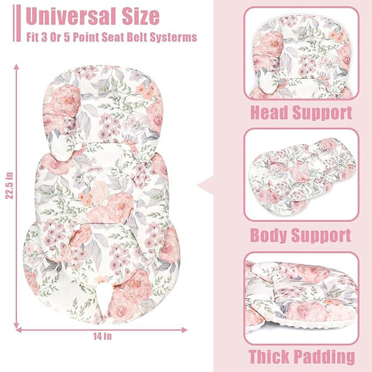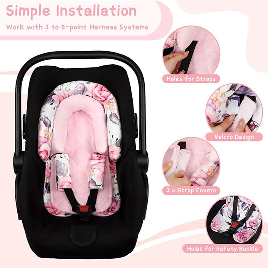 Pea Pod Infant Car Seat Insert with 3 Strap Covers, 3 in 1 Reversible Flower Baby Car Seat Head Support for Newborn, 3D Soft Minky Carseat Cushion for Preemie to Infant, Stroller, Swing, Bouncer