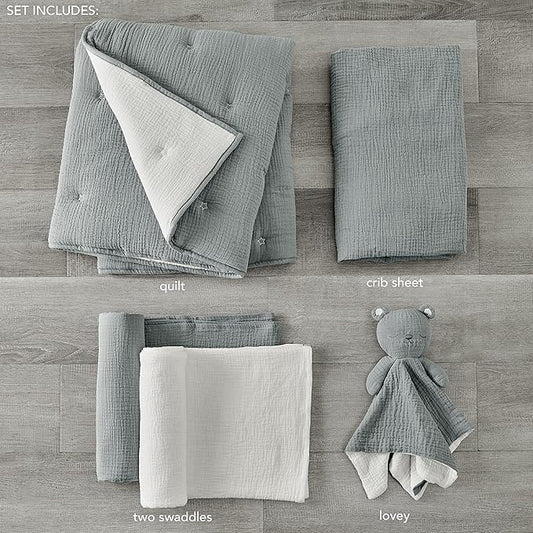 Levtex Baby - Cloud Muslin Crib Bed Set - Baby Nursery Set - Grey and White Stars - Grey Textured Muslin - 5 Piece Set Includes Quilt, Fitted Sheet, Two Swaddles & Bear Lovey