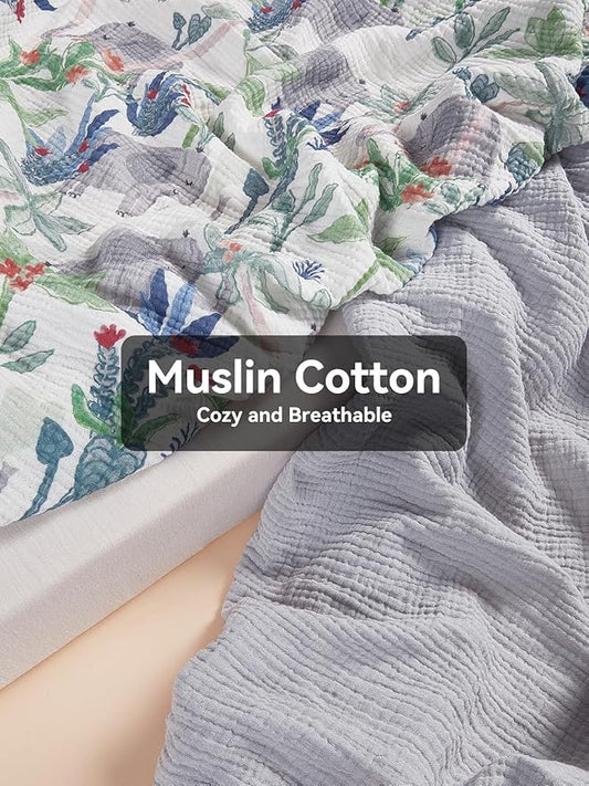 TILLYOU Muslin Crib Sheets for Boys and Girls 2 Pack, Neutral Soft Cotton Baby Crib Mattress Protector, for 52x 28 Toddler Bed, Rainforest Elephant & Grey
