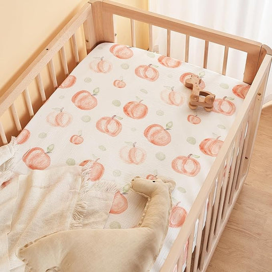 TILLYOU Muslin Crib Sheets for Boys and Girls 2 Pack, Neutral Soft Cotton Baby Crib Mattress Protector, for 52x 28 Toddler Bed, Peach dot & Light Green