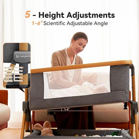 Cozy2 Baby Bedside Bassinet Sleeper Portable Travel Bassinet with Bigger Wheels 3 in 1 Bassinet Crib with Mattress, Storage Basket 5 Height Adjustable Bedside Crib for Baby - Wood Grain