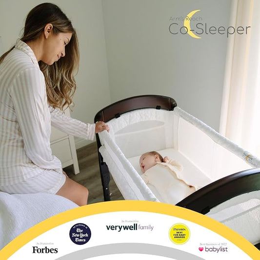 Arm’s Reach Cambria Co-Sleeper Bedside Bassinet Featuring Height-Adjustable Legs, Curved Wooden Ends, Breathable Mesh Sides with Pockets, and Large Lower Storage Basket, Espresso and White