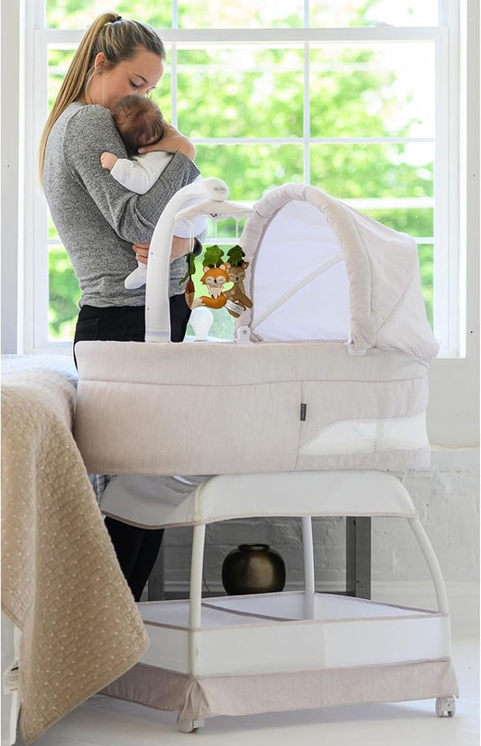 Baby Sweetli Calm Infant Bassinet Bedside Crib Sleeper with Cry Recognition, Electric Mobile with Deluxe Toys, Music, Nightlights, Vibration (Wheat Melange)