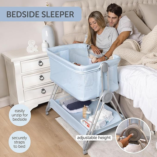 Baby Bedside Sleeper - Bassinet & Bedside Crib with Height Adjustment & Wheels - Can Be Placed Next to Bed - Attaches to Parents Bed - Easy to Fold & Carry Bassinet for Boys (Blue)