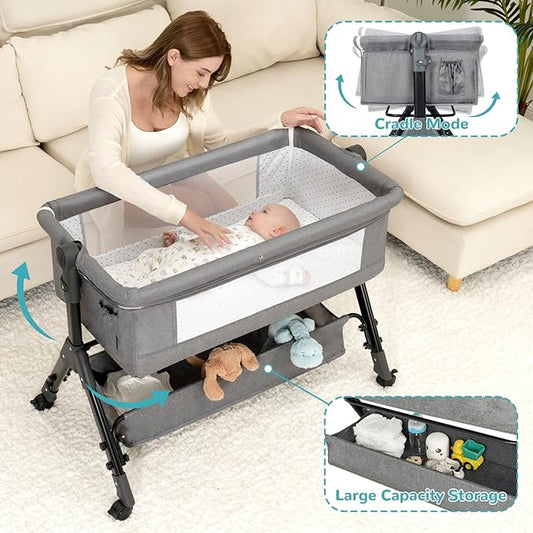 Baby Bedside Sleeper - Bassinet & Bedside Crib with Height Adjustment & Wheels - Can Be Placed Next to Bed - Attaches to Parents Bed - Easy to Fold & Carry Bassinet (Grey)