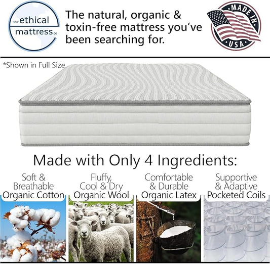 Ethical Mattress CO 10" Toxin-Free Hybrid Mattress, Made in The USA with Organic Cotton, Wool, Latex & Pocketed Coils (No Fiberglass or Polyfoams) Comfortable & Supportive Bed-in-Box - Twin XL Size