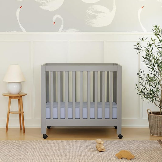 Babyletto Origami Mini Portable Folding Crib with Wheels in Grey, 2 Adjustable Mattress Positions, Greenguard Gold Certified