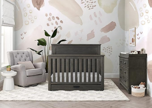 Delta Children Simmons Kids Caden 6-in-1 Convertible Crib with Trundle Drawer, Greenguard Gold Certified, Rustic Grey