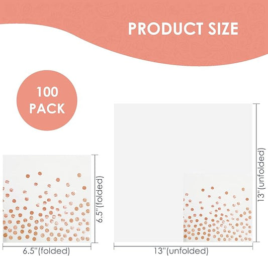 13 x 13 In White and Rose Gold Paper Napkins for Wedding Reception,Disposable Rose Gold Dot Beverage Napkins,50 Pack Cocktail Napkins for Bridal Shower, Birthday Party Supplies