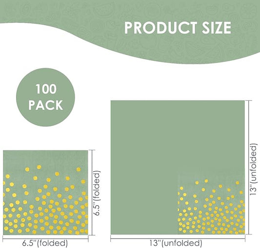 13 x 13 In Sage Green Cocktail Napkins,100 Pack Sage Green Napkins Disposable with Gold for Baby Shower Birthday Wedding Party Supplies