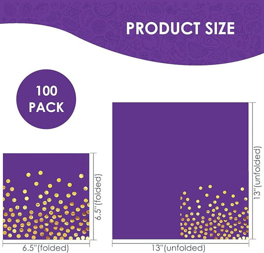 13 x 13 In Purple Cocktail Napkins,Purple and Gold Beverage Napkins,100 PCS Disposable Paper Napkins for Bar,Weddings,Birthday Party Supplies