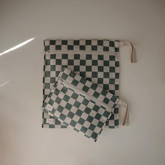 mushie Water Resistant Wet Bags | Large & Small Reusable Storage Bag for Baby Items and Travel | Zippered Pockets with Handle | Machine Washable, Set of 2 (Olive Check)