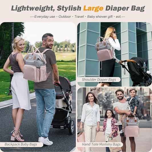 Diaper Bag Backpack: Tote Baby Bag for Boy and Girl, Large Mommy Bag Insulated Pockets Charger Holes for Men and Women, Nappy Bag for Baby Airplane Traveing Pink Gray
