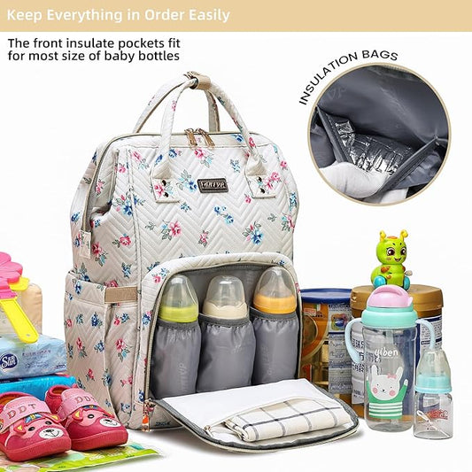 Diaper Bag Backpack, Diaper Bags for Baby Girls Boys, Baby Bags for Moms Dads, Nappy Changing Bag with Insulated Pockets,Multi-functional Waterproof Backpack with Stroller straps-Beige Flowers