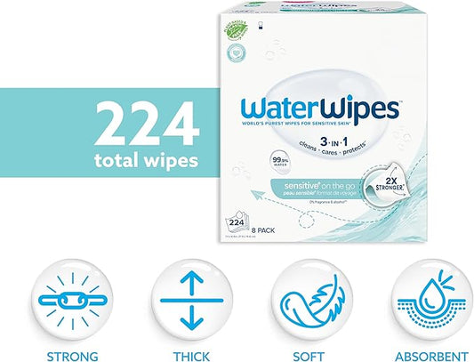 WaterWipes Sensitive+ On The Go Wipes, 3-In-1 Cleans, Cares, Protects, 99.9% Water, Unscented & Hypoallergenic Wet Wipes, 224 Count (8 Packs)
