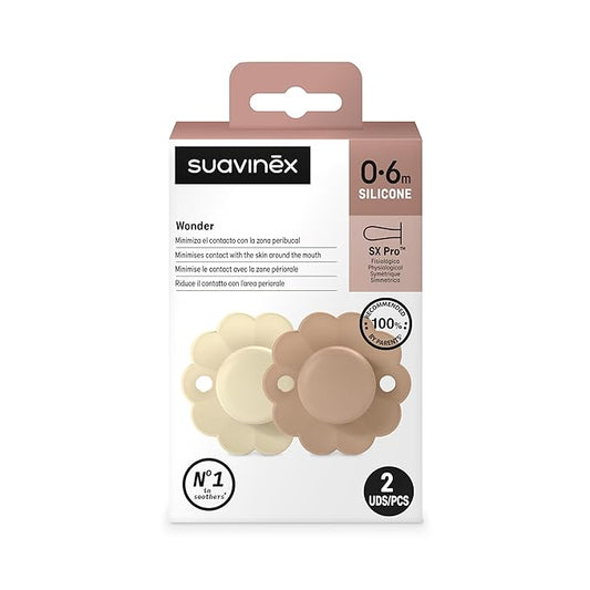 Suavinex Wonder Baby Pacifier, SX Pro Silicone Nipple, Reversible, Non Irritating Shield Design, 2Pk Pacifiers 6-18 Months, Made in Europe, Gray/Umber