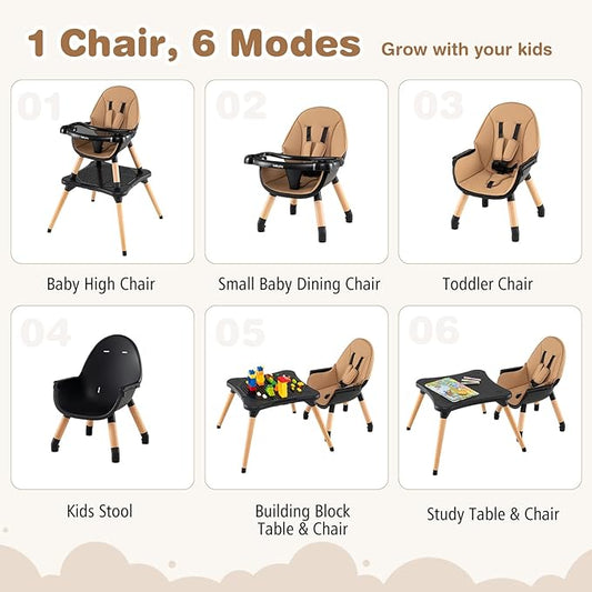 BABY JOY 6 in 1 High Chair, Convertible High Chairs for Babies and Toddlers/Booster Seat/Table and Chair Set, Infant Wooden Highchair w/ 5-Point Harness, 4-Position Removable Tray & PU Cushion, Coffee