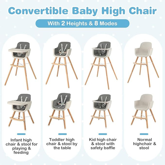 8 in 1 Highchair, Convertible Wooden Baby High Chair with Tray, Adjustable High Chair for Babies and Toddlers, Easy to Clean, Grow with Family|Booster|Learning Table|High Stool