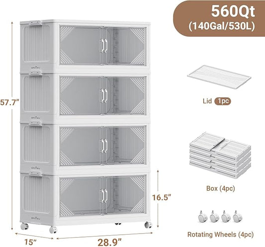 140Gal Plastic Stackable Storage Bins with Lid, 560QT Extra Large Closet Organizers Collapsible Cabinets Boxes with Drawers, Foldable Containers with 4X Wheels for Home Kitchen, V60 4Pack White
