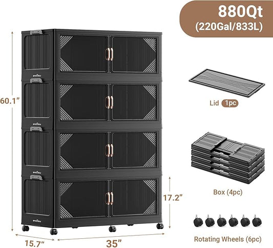 220Gal Plastic Stackable Storage Bins with Lid, 880QT Extra Large Closet Organizers Collapsible Cabinets Boxes With Drawers, Foldable Containers with 6x Wheels for Home Kitchen, V60 4Pack Black