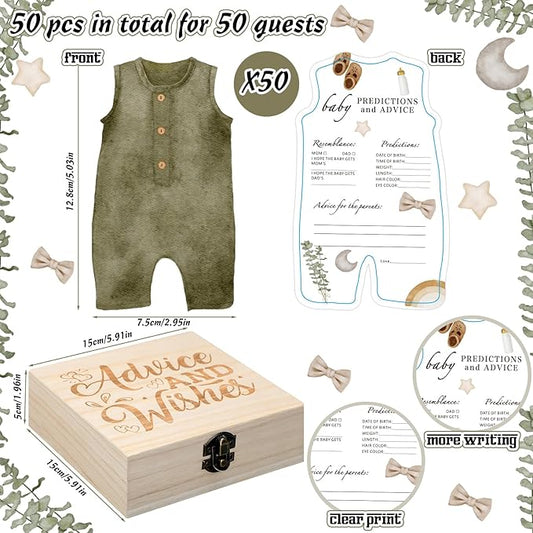50 Pcs Double Side Green Cloth Baby Predictions & Advice Neutral Boy Cards for New Parents Baby Shower Games with Cards Wooden Keepsake Box for Wishes Decorations