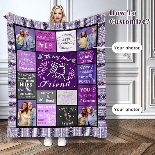 BFF Best Friend Custom Personalized Blanket Thow Gifts with Photo, Customized Pictures Blankets Gift for Sister Women Girls Christmas Birthday (Purple Grid Friend)