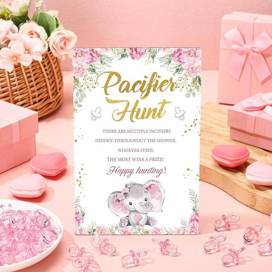 Thyle 51 Pcs Pacifier Hunt Baby Shower Games Include Hunt Sign and 50 Acrylic Pacifiers for Baby Shower Game Decoration Gift Sets Gender Reveal Party Decor(Pink Elephant)