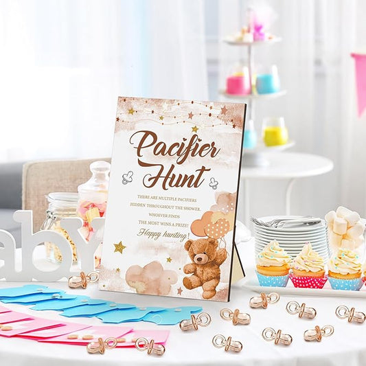 Thyle 51 Pcs Pacifier Hunt Baby Shower Games Include Hunt Sign and 50 Acrylic Pacifiers for Baby Shower Game Decoration Gift Sets Gender Reveal Party Decor(Brown Bear)