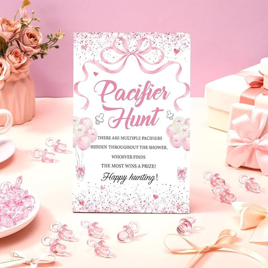 Thyle 51 Pcs Pacifier Hunt Baby Shower Games Include Hunt Sign and 50 Acrylic Pacifiers for Baby Shower Game Decoration Gift Sets Gender Reveal Party Decor(Pink Bow)
