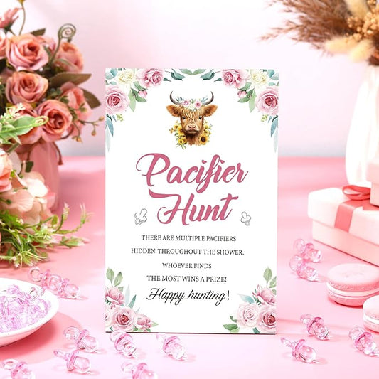Thyle 51 Pcs Pacifier Hunt Baby Shower Games Include Hunt Sign and 50 Acrylic Pacifiers for Baby Shower Game Decoration Gift Sets Gender Reveal Party Decor(Highland Cow)