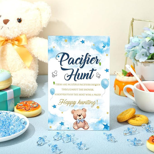 Thyle 51 Pcs Pacifier Hunt Baby Shower Games Include Hunt Sign and 50 Acrylic Pacifiers for Baby Shower Game Decoration Gift Sets Gender Reveal Party Decor(Blue Bear)