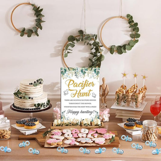 Thyle 51 Pcs Pacifier Hunt Baby Shower Games Include Hunt Sign and 50 Acrylic Pacifiers for Baby Shower Game Decoration Gift Sets Gender Reveal Party Decor(Greenery)