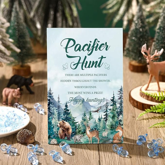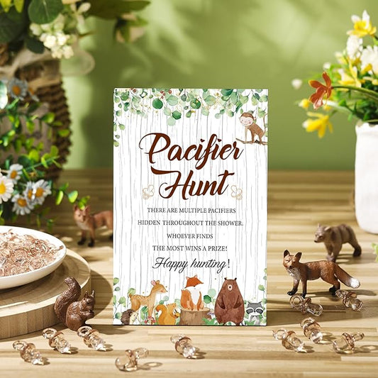 Thyle 51 Pcs Pacifier Hunt Baby Shower Games Include Hunt Sign and 50 Acrylic Pacifiers for Baby Shower Game Decoration Gift Sets Gender Reveal Party Decor (Woodland Animals)