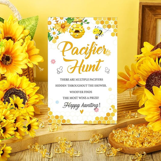 Thyle 51 Pcs Pacifier Hunt Baby Shower Games Include Hunt Sign and 50 Acrylic Pacifiers for Baby Shower Game Decoration Gift Sets Gender Reveal Party Decor(Bee)