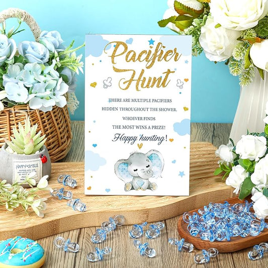 Thyle 51 Pcs Pacifier Hunt Baby Shower Games Include Hunt Sign and 50 Acrylic Pacifiers for Baby Shower Game Decoration Gift Sets Gender Reveal Party Decor(Blue Elephant)