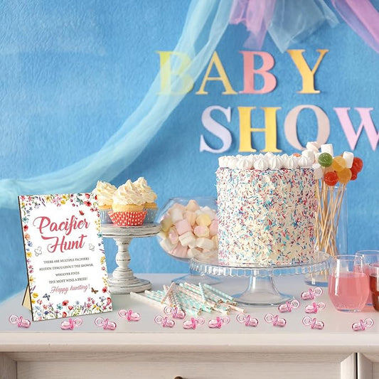 Thyle 51 Pcs Pacifier Hunt Baby Shower Games Include Hunt Sign and 50 Acrylic Pacifiers for Baby Shower Game Decoration Gift Sets Gender Reveal Party Decor(Wildflower)