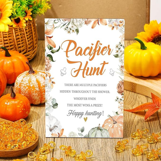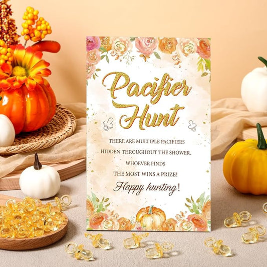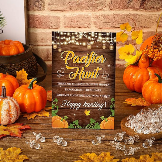 Thyle 51 Pcs Pacifier Hunt Baby Shower Games Include Hunt Sign and 50 Acrylic Pacifiers for Baby Shower Game Decoration Gift Sets Gender Reveal Party Decor(Fall Pumpkin)