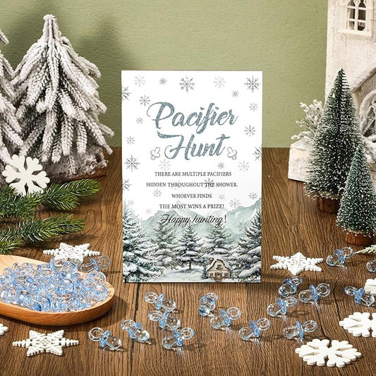 Thyle 51 Pcs Pacifier Hunt Baby Shower Games Include Hunt Sign and 50 Acrylic Pacifiers for Baby Shower Game Decoration Gift Sets Gender Reveal Party Decor(Baby It's Cold Outside)
