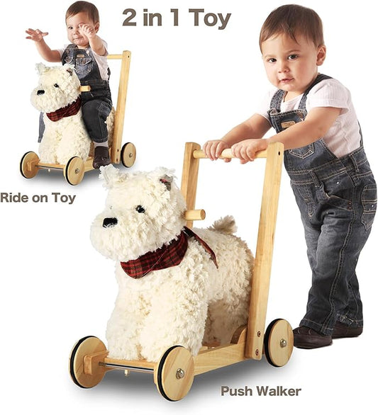 Wooden Baby Walker, 2-in-1 Baby Push Walker & Ride On Toy for Toddlers 12M+, Learning to Walk Toy with Sweet Music, Soft Cuddly Dog Toy for Boys Girls (Scottie Dog) CPC Certified