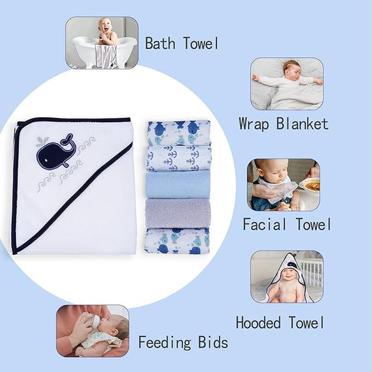 Viviland Baby Towels and Washcloths, Soft Absorbent Baby Boy Bath Towel Set, Whale Hooded Towels with 5 Infant Washcloths,(6 Pieces)