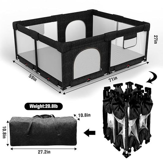 Foldable Baby Playpen with Gate, Extra Large Collapsible Play Yard for Babies & Toddlers, Portable Travel Play Pen with Fence, Safe Activity Center for Indoor & Outdoor Use (59"×71" Black)