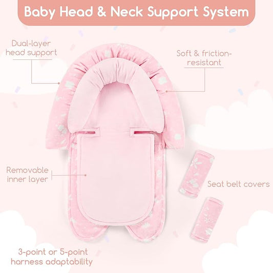 Baby Infant Head and Neck Support Pillow with Seat Belt for Car Seat -Extra Soft 3-in-1 Toddler Car Seat Insert Cushion Pad for Car Seats Water Pink