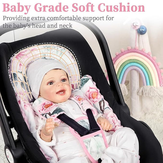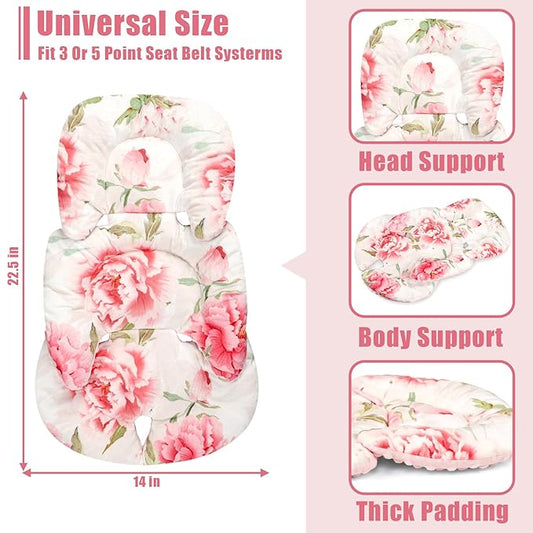 Infant Car Seat Insert, Enlarged Head Support for Baby Carseat, Reversible Newborn Insert with 3 Strap Covers, 2-in-1 Baby Car Seat Cushion for Stroller, Swing, Bouncer, Rocker - Pink Floral
