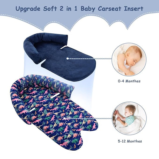 SWESEN Baby Car Seat Head Support, Super Soft 2 in 1 Infant Car Seat Insert, Reversible Newborn Car Seat Insert Cushion with Strap Covers for Strollers, Bouncers, Swing, Dinosaur