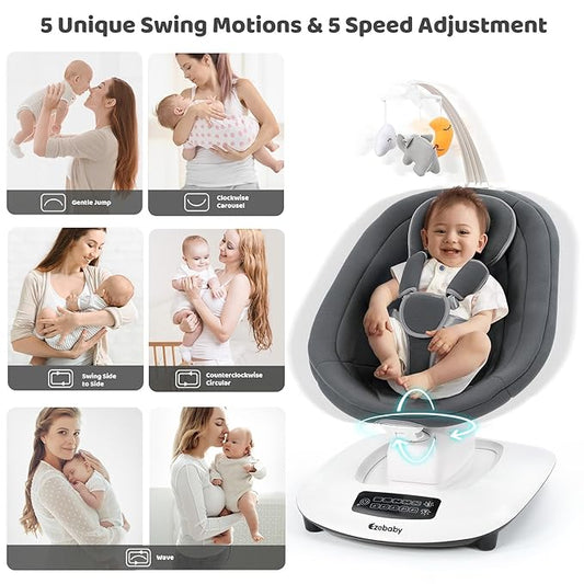 Ezebaby Baby Swing for Infants and Newborns with 5 Unique Motions, Adjustable Speed and Positions, Lullabies, Infant Swing with 5-Point Harness, Baby Swing for Newborn Babies 0-9 Months Grey