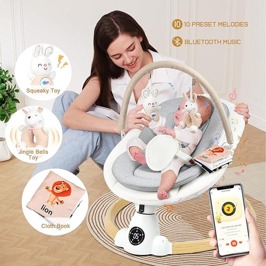 Electric Baby Swing for Infants, with Bluetooth Remote Control Timing Function and 10 Music 5 Swing Speeds 3 Seat Positions Baby Bouncer for Boy Girl Indoor & Outdoor Use (Lvory White)