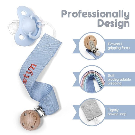 TYRY.HU Personalized Pacifier Clip with Name, Embroidery Pacifier Holder for Baby Girls and Boys, Neutral Binky Clips Universally Fit All Pacifiers & Baby Toys, Baby Gift, 2 Pack(Blue,Light Blue)
