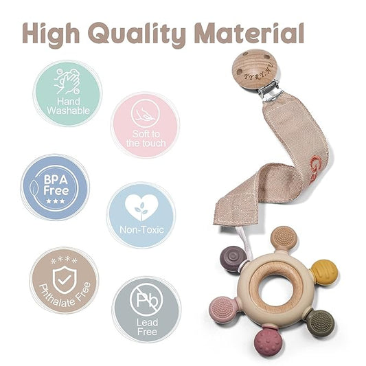 Socub 3 Pack Pacifier Clips for Baby Boys and Girls, Fabric Pacifier Hold with Clip for Binky, Teether Toys, BPA Free, Baby Shower Birthday Gift, 3 Month+(Sage/Clay/Mustard)