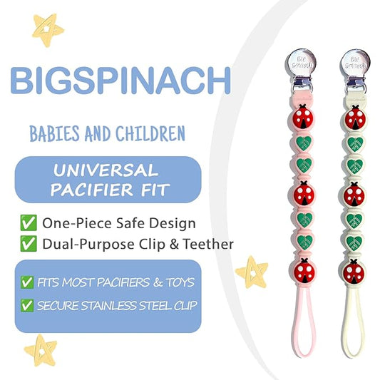 2 Pack Silicone Pacifier Clips for Baby Boys – Food Grade One-Piece Strap with Cord & Stainless Clip – Teether Holder for Baby – Cute Ladybug & Leaf Design – BPA-Free(Beige+Pink)